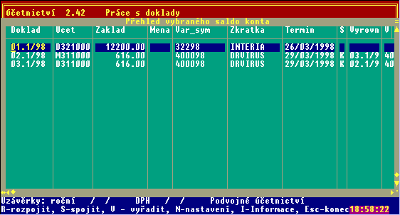 - R - Rozpojit: Touto funkcí rozpojíte již spojené pohyby. Pracuje se stejně jako při spojování s tím, že k rozpojení se nabídnou spojené pohyby jednoho účtu pouze z odpovídajícího časového horizontu.
