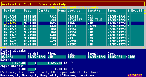 Příprava funkce Úpravy salda může trvat u velké firmy až několik minut. Na počátku se totiž musí načíst a přepočítat veškeré položky saldokonta. V horní části je přehled jednotlivých položek, v dolní části detailní informace o právě vybrané položce. Základní úpravy se provádějí pomocí kláves: Zobrazení:Alt-K nebo F10-Konec ukončí práci s úpravami salda. F8 přepíná zobrazení mezi přehledem (jsou vidět veškeré nespojené položky a z ostatních jen jedna položka) a detaily (jsou vidět všechny pohyby). F5 nastavuje výběr pro zobrazení. Ctrl-Home ukáže, s čím je vybraná položka spárována. Úpravy:S Spojit: Řádek, který je zvýrazněn, bude spárován s řádkem, který mu určíte z následující nabídky. R Rozpojit: Spárované řádky nebo vyřazený řádek budou rozpojeny - spárované pohyby budou vráceny mezi nevyrovnané. Při "rozpojení" vyřazených plateb postupujte s krajní opatrností podle poznámky k funkci vyřadit. V Vyřadit: Vyřazení se používá u pohybů, které jsou fakticky vyrovnané, ale není možné je spárovat pomocí funkce S s odpovídajícím protipohybem. S pohledávkou se dále zachází, jako by byla zaplacená. Pozor. S funkcí Vyřadit zacházejte velmi opatrně. Vyřazovat je třeba jedině současně více pohybů na jednom účtu tak, aby jejich součet (s respektováním stran MD/Dal) byl nulový. Hromadné operaceHromadné operace vyvoláte v úpravách salda pomocí F10-Manipulace. Hromadné párováníHromadné párování slouží k rychlému spojení těch položek salda, které lze spojit bez významného rizika chyb. O spojených položkách připraví program protokol. Program spojí následující položky: